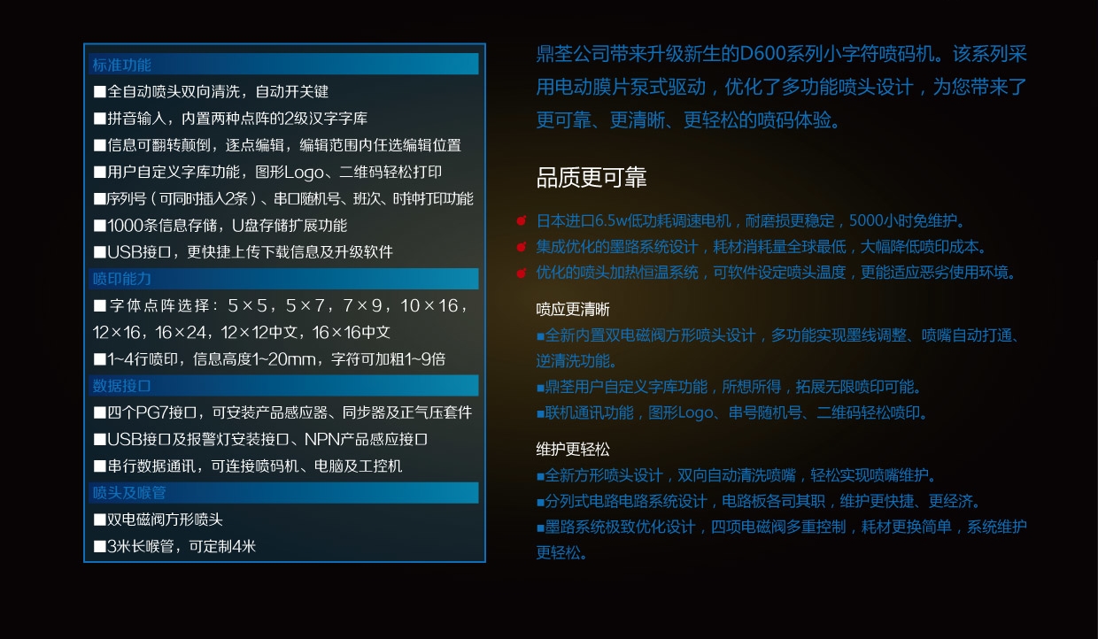 鼎荃公司帶來升級新生的D600系列小字符噴碼機。該系列采用電動膜片泵式驅動,優化了多功能噴頭設計,為您帶來了更可靠、更清晰、更輕松的噴碼體驗。